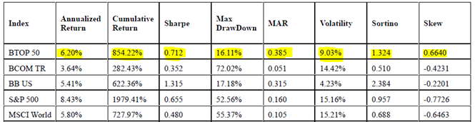 Table 2 Performance - BTOP50 CTA, BCOM TR, Barclays Agg “BB US), SP500, & MSCI World since BTOP50 Inception (1987).