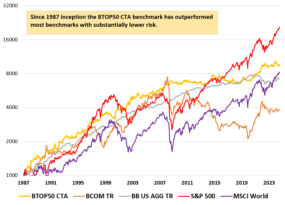 Chart 5 – BTOP50 CTA vs MSCI ACWI, BCOM TR, Barclays Agg, & SP500 since BTOP50 Inception (1987).