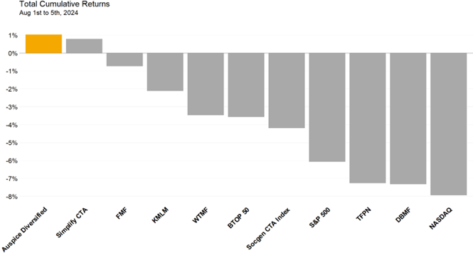 As the US market opened on August 5th the flagship Auspice Diversified was up just over 2.5% for the day and month, delivering accretive crisis alpha as it has done so reliably for 18 years. How does this happen? What can you expect from Auspice Diversified and how does it compare to other CTAs during equity selloffs?