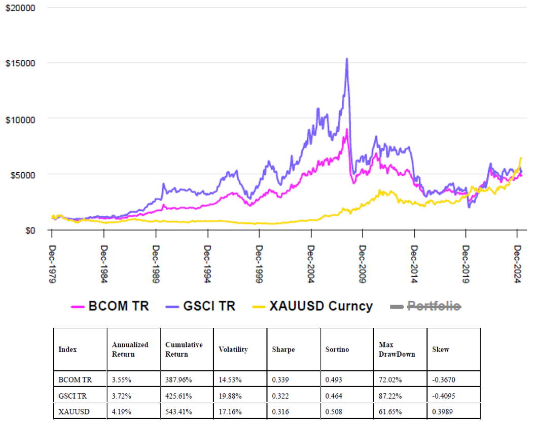 Chart 2: Gold vs Broad Commodities Jan 1980 – May 2025