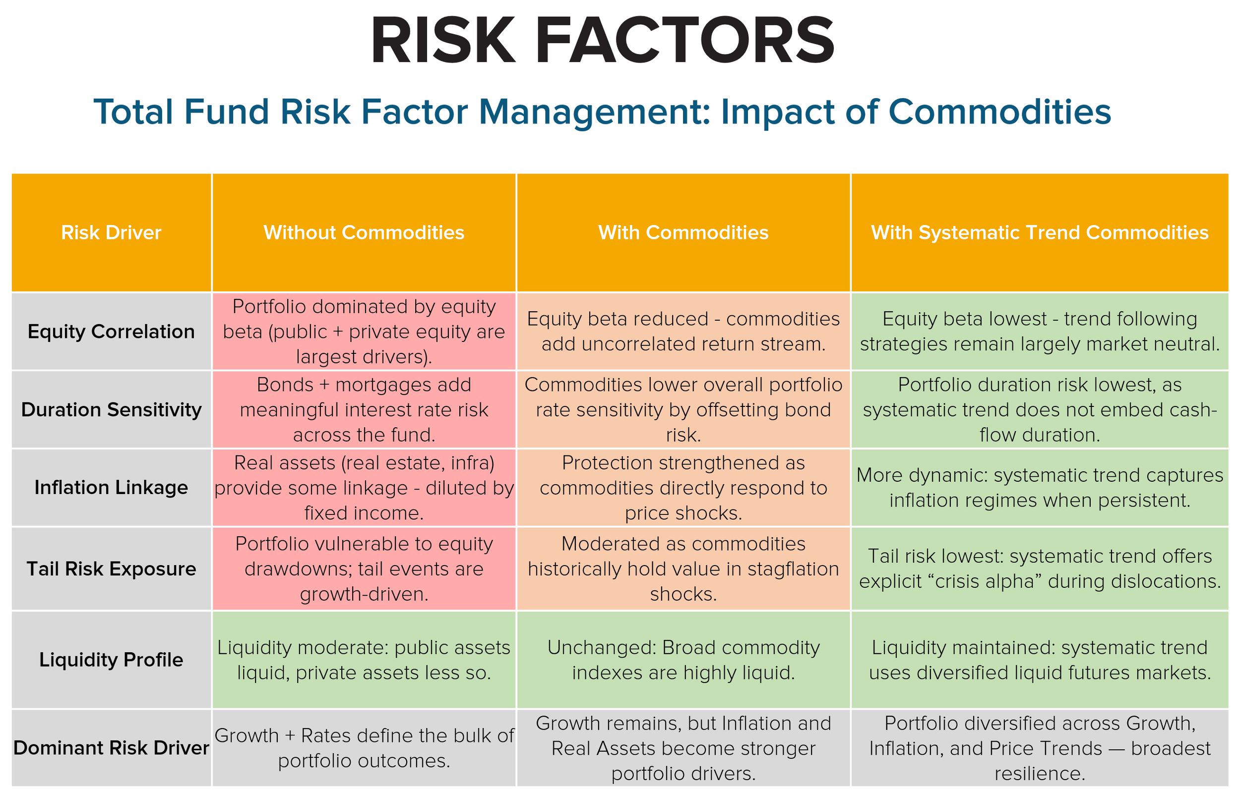 Within the TPM framework, we look at commodities in terms of the exposures they add or risks they help neutralize at the total fund level. We argue that commodities improve the risk factor exposures that ultimately enhance total portfolio resilience across market cycles.