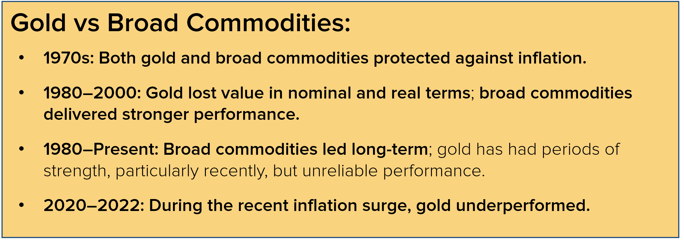 As Figure 4 highlights, Gold’s history as an inflation hedge is inconsistent, influenced by monetary policy, sentiment, and currency fluctuations.
