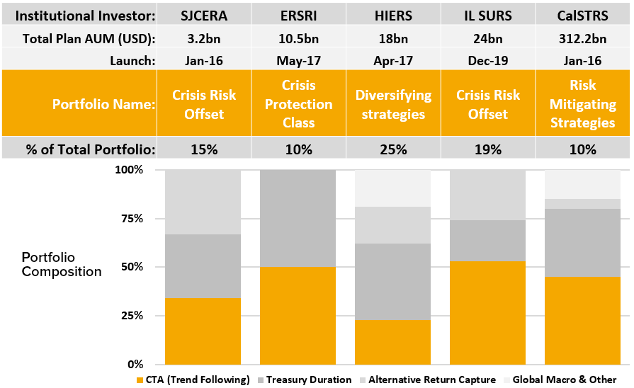 Source above: “The Institutional Use of Commodities & CTAs”, Auspice. Published November 2021 and data as of then. SJCERA is San Joaquin Country Employees’ Retirement Association. ERSRI is Employees’ Retirement System of Rhode Island. HIERS is the State of Hawaii Employees’ Retirement System. Illinois SURS is the State Universities Retirement System of Illinois. CalSTRS is California State Teachers’ Retirement System.