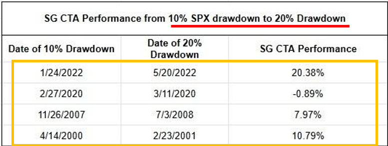 However, as a selloff becomes more significant, trend-following CTAs have been a reliable source of crisis alpha. Note the gold boxes in Table 1 above. In these four periods the S&P 500 correction reached 20%. As you can see below in Table 2, performance during these meaningful corrections is strong.