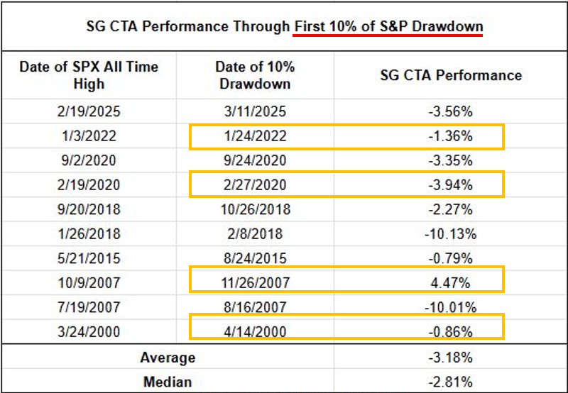 Consider Table 1 below with historical SG CTA performance during the first 10% of a S&P 500 drawdown. As you can see, our financially focused CTA peers have on average lost 3% when the S&P 500 has traded down 10% from highs. While negative, CTA peers deliver a better result than equity beta.