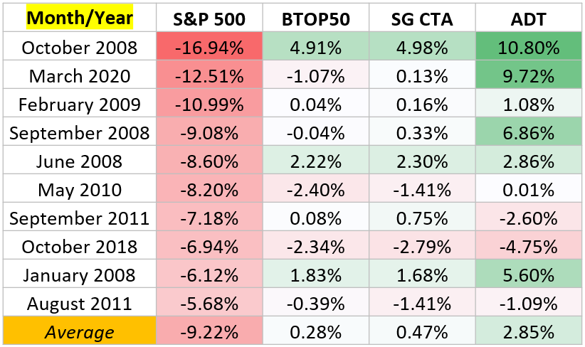 Table 3: BTOP50 CTA, SG CTA, and Auspice Diversified performance during the worst 10 S&P 500 months: