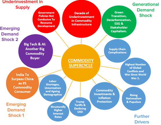 As we entered the 2020s, COVID hit while the commodity setup quietly took shape in the background. Capex peaked broadly in commodities circa 2012-14, then softened, and remains below those levels. On the demand side, we believe there haven’t been as many significant commodity drivers since industrialization and post-WW2. There isn’t just one factor like China in the 2000s cycle; there are many (illustrated in Figure 5).