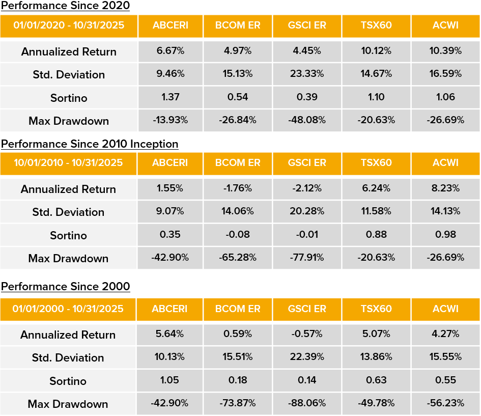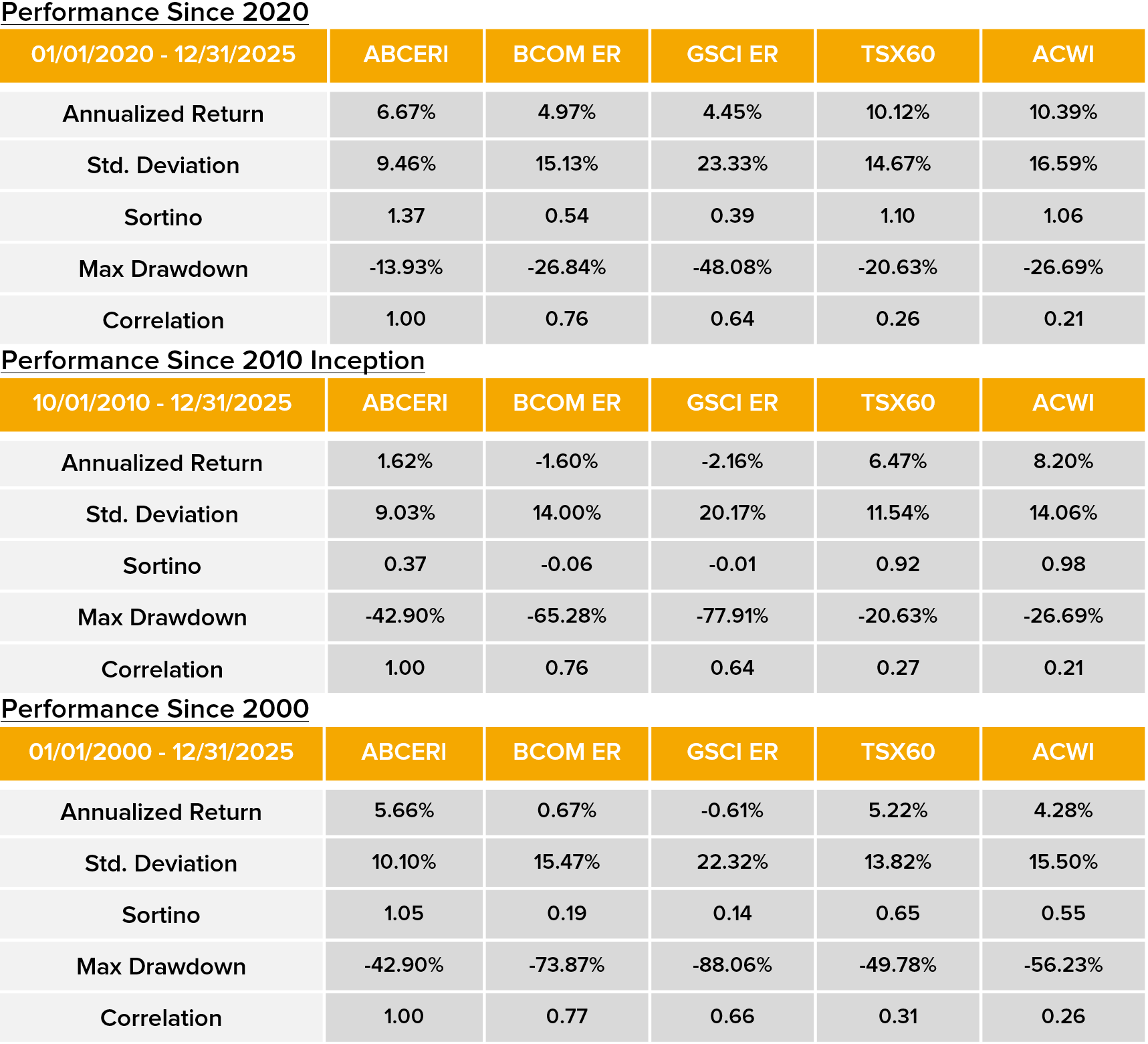 The Auspice Broad Commodity Index (ABCERI) aims to capture upward trends in the commodity markets while minimizing risk during downtrends.