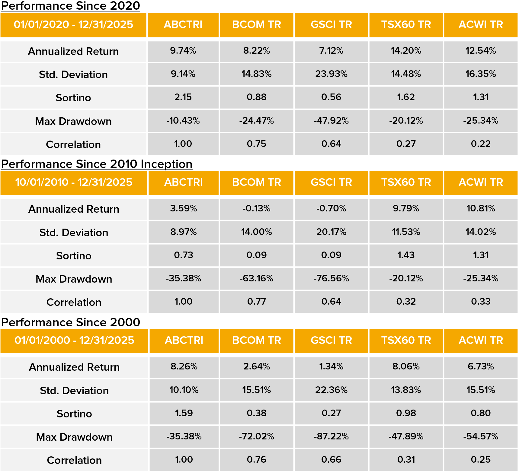 *The performance of Auspice Broad Commodity Index prior to 9/30/2010 represents index data simulated prior to third party publishing as calculated by the NYSE from 1/1/2000. Source: Bloomberg and Auspice Investment Operations, as at December 31st, 2025. You cannot invest directly in an index.