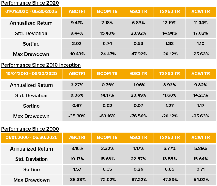 *The performance of Auspice Broad Commodity Index prior to 9/30/2010 represents index data simulated prior to third party publishing as calculated by the NYSE from 1/1/2000. Source: Bloomberg and Auspice Investment Operations, as at May 31st, 2025. You cannot invest directly in an index.