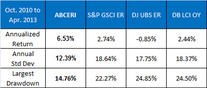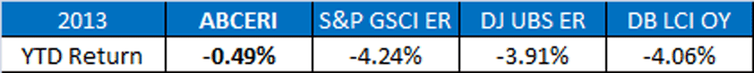 The ABCERI lost 1.42% in April to be off a mere 0.49% in 2013 despite continued commodity pressure. The monthly loss was far less than the peer group and the index continues to outperform. (see table below). The strategy had a few position changes during the month, holding only 2 components or 17% of the basket long at this time.