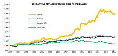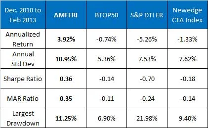 The performance of AMFERI versus both investable and non-investable managed futures indices has been good. Since the launch of the index in December 2010, AMFERI continues outperform on both an absolute and risk-adjusted basis.