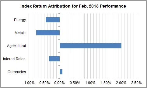 After a big shift in January from a multi-year long position, the index is now tilted to take advantage of higher interest rates (short bonds). There was a small loss from this sector as prices rose during the month.