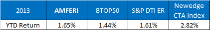 As seen in the next table, the performance of AMFERI versus both investable and non-investable managed futures indices has been good. Since the launch of the index in December 2010, AMFERI continues outperform on both an absolute and risk-adjusted basis.