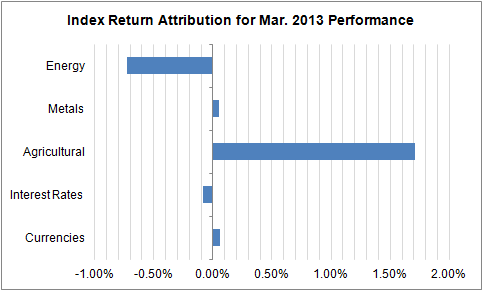 Currencies made modest sector gains in March. Position weights have not changed since February and thus make the Currency sector evenly balanced long and short. Gains were primarily made on the long side in Aussie dollar and US Dollar Index as those markets moved higher. However, small gains were also made short the Japanese Yen and British Pound. The index remains long the Euro and short the Canadian dollar at this time.