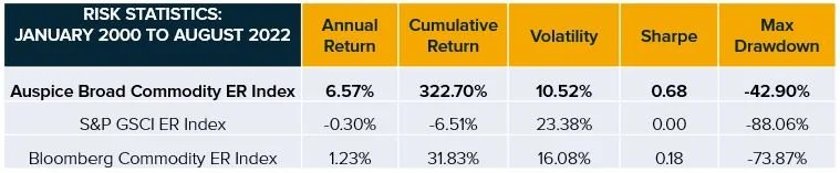 Source: Bloomberg L.P., as at August 31, 2022. The performance of Auspice Broad Commodity Index prior to 9/30/2010 is simulated and hypothetical as published by the NYSE. See below for important information