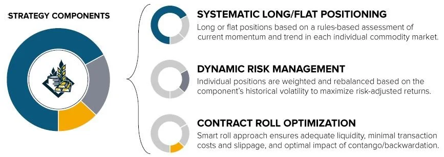 The index is a tactical long strategy that focuses on Momentum and Term Structure to track either long or flat positions in a diversified portfolio of commodity futures which cover the energy, metal, and agricultural sectors. The index incorporates dynamic risk management and contract rolling methods. The index is available in total return (collateralized) and excess return (non-collateralized) versions.